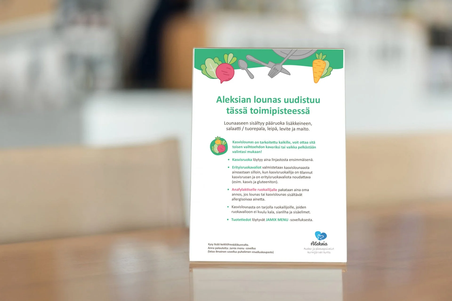 Nurmijärven kunnan omistama Aleksia-liikelaitos vastaa ruokapalveluista kouluissa päiväkodeissa. Uusien ravitsemussuositusten myötä osassa päiväkoteja ja kouluja käynnistyi pilotti, jossa kasvisruokaa tarjottiin lapsille linjastossa ensisijaisena vaihtoehtona. Toteutin kuvitukset, tarrasovellukset ja infomateriaalin, joilla merkitään kasvis- ja sekaruokavaliot linjastossa. Asettelulla ja kuvituksilla pyritään ohjaamaan kasvisvaihtoehdosta kiinnostava ja ensisijainen valinta päiväkodeissa ja peruskouluissa. Kuvitustyylissä otettiin huomioon eri ikäiset kohderyhmät ja pyrittiin tekemään siitä visuaalisesti kiinnostava taaperosta teini-ikäisiin.